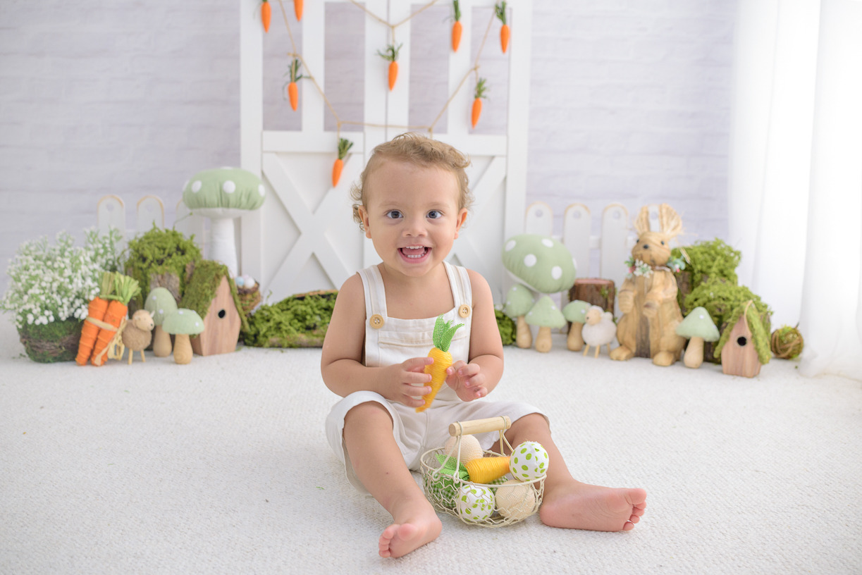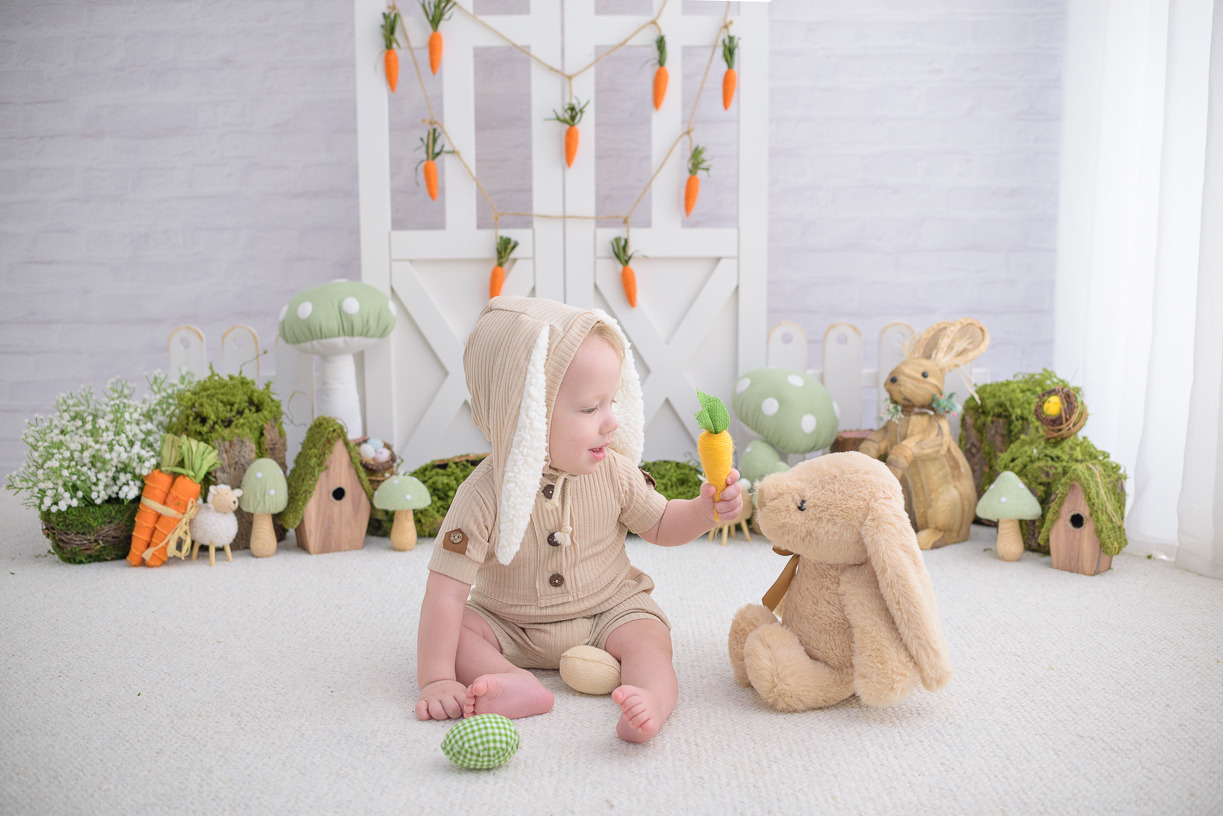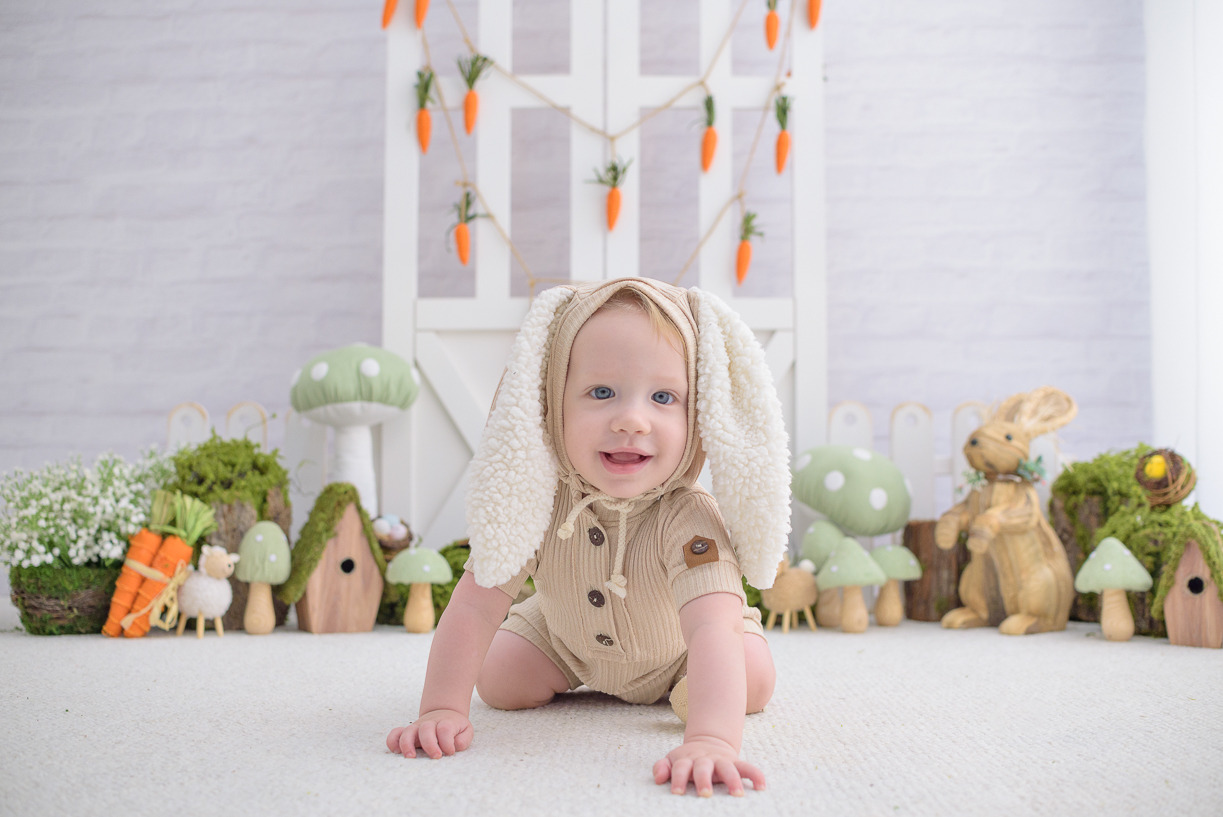 Cada elemento desse ensaio foi cuidadosamente escolhido para criar um ambiente lúdico e delicado. Coelhinhos, cenouras, musgos, tons neutros e texturas suaves compõem um espaço que valoriza aquilo que realmente importa: a expressão mais pura do seu pequeno. Aqui, ele pode brincar, sorrir e viver a magia da infância enquanto capturamos cada instante de forma autêntica e cheia de emoção.