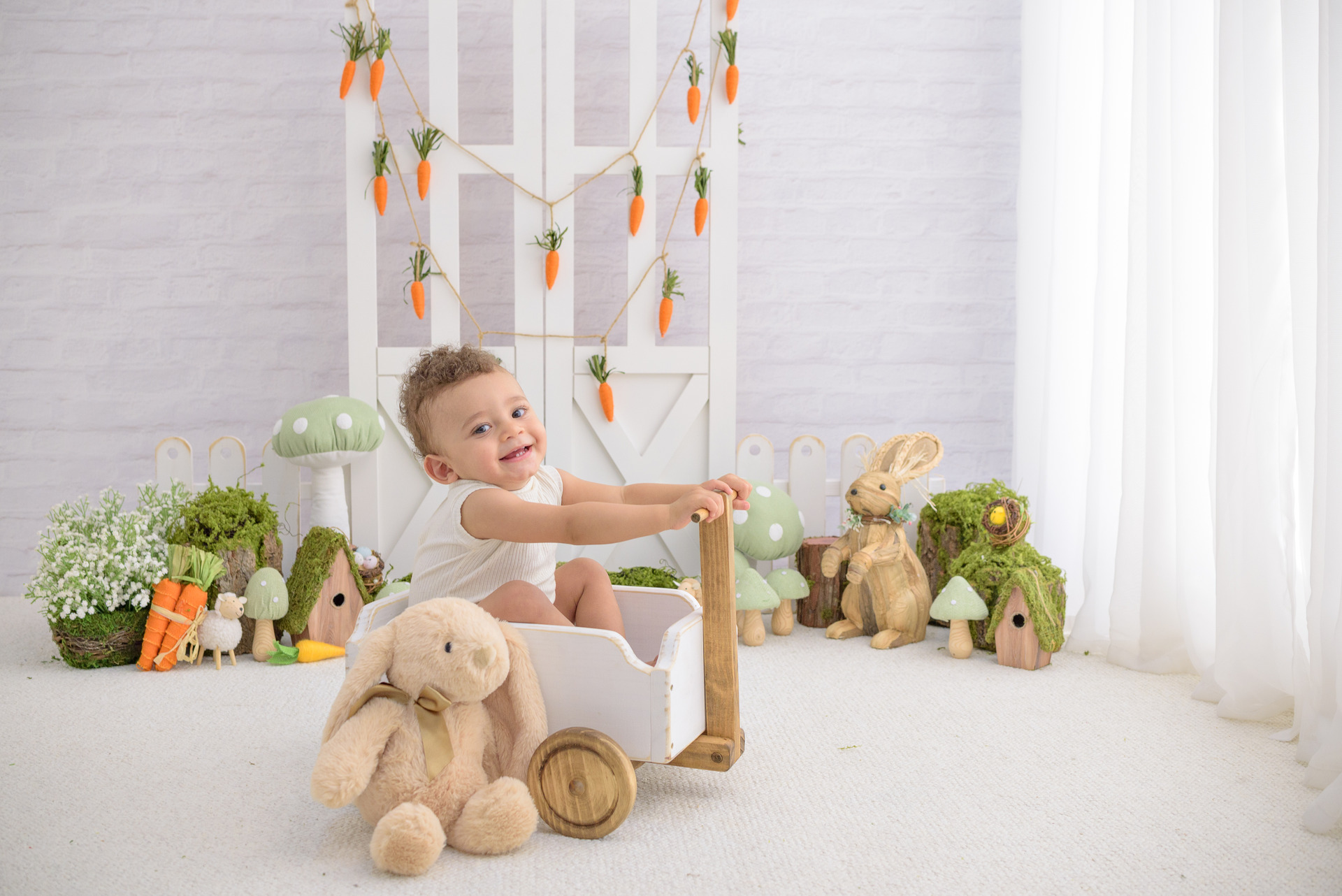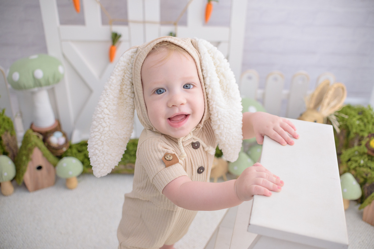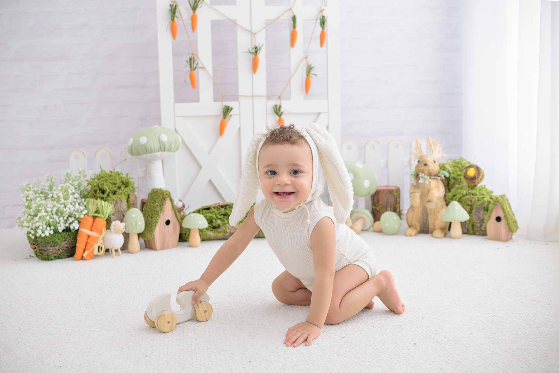 Cada elemento desse ensaio foi cuidadosamente escolhido para criar um ambiente lúdico e delicado. Coelhinhos, cenouras, musgos, tons neutros e texturas suaves compõem um espaço que valoriza aquilo que realmente importa: a expressão mais pura do seu pequeno. Aqui, ele pode brincar, sorrir e viver a magia da infância enquanto capturamos cada instante de forma autêntica e cheia de emoção.